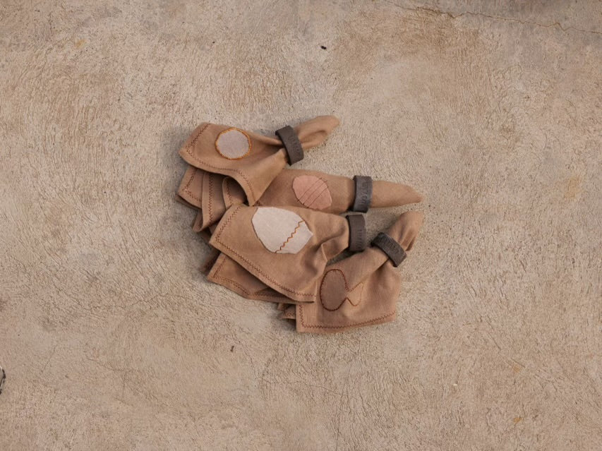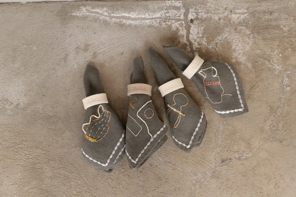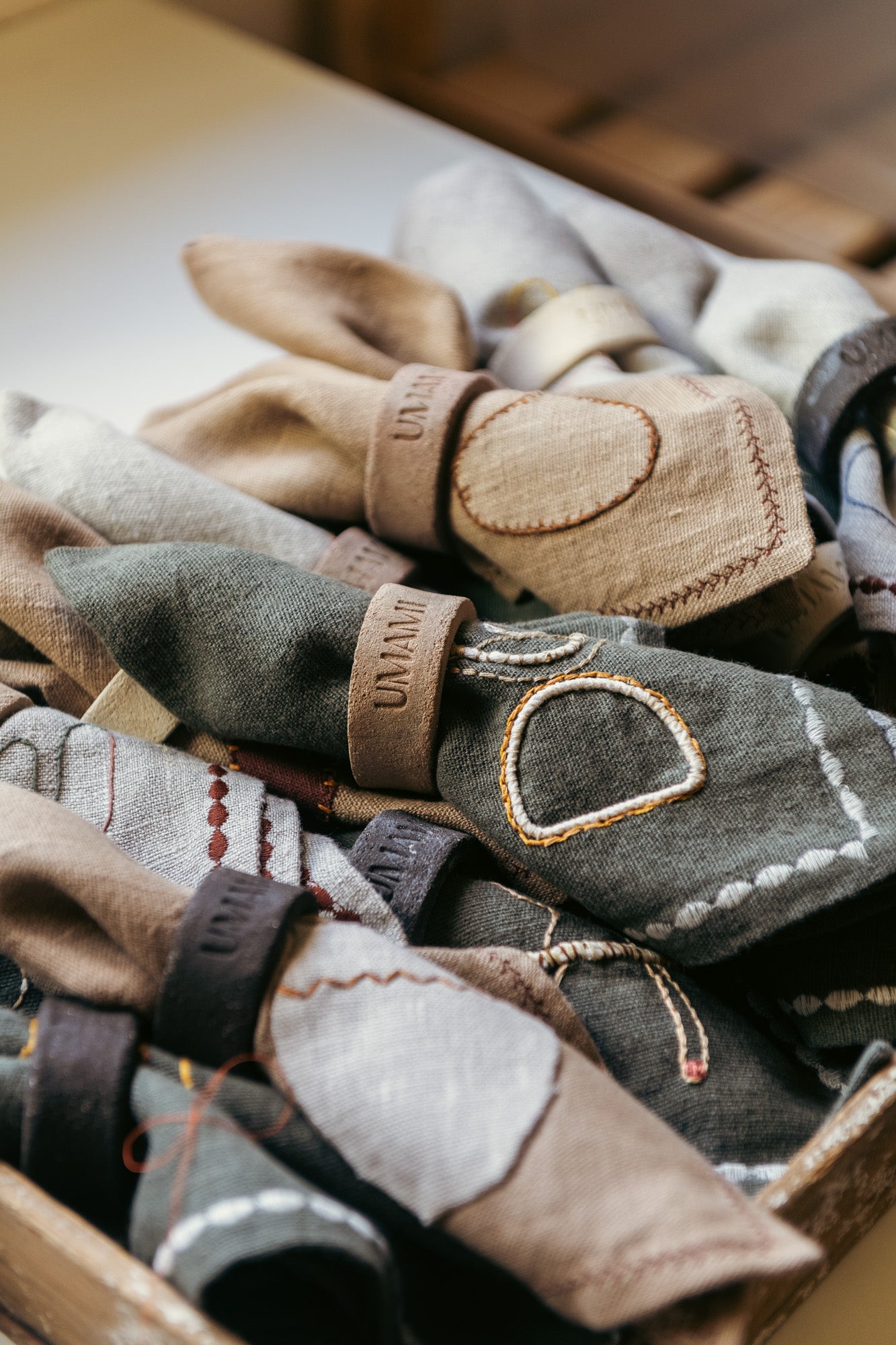 Nos serviettes ‘Agape’ incarnent l’essence d’Umami : teintes puisées des palettes naturelles, des courbes fluides et des formes évoquant des paysages lointains, dans une symphonie de marron, terracotta, kaki, noir et sable.