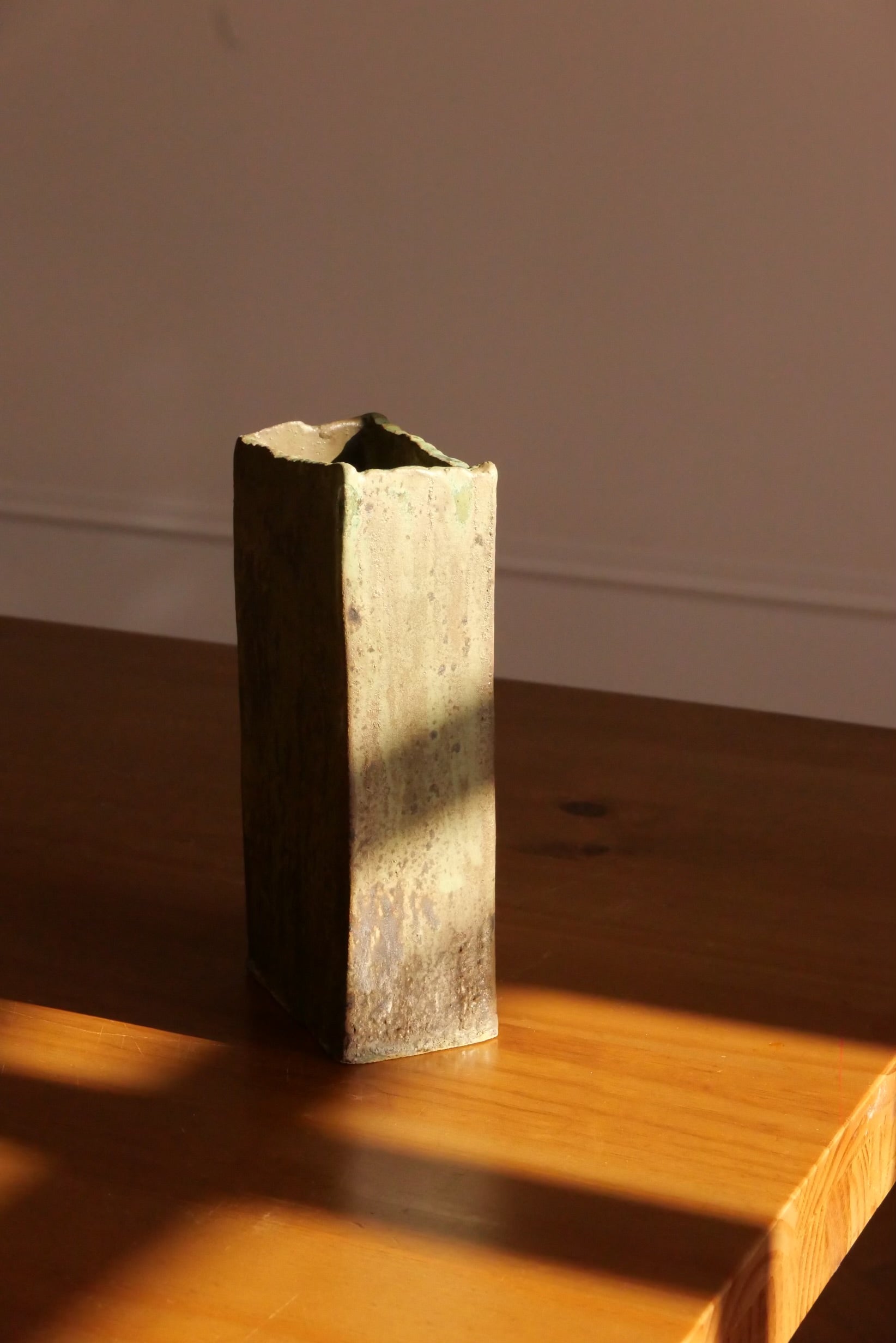 Réalisé en grès beige, ce vase se distingue par l’application d’un émail à effet dont la texture évoque tantôt l’écume marine, tantôt la pierre malachite.