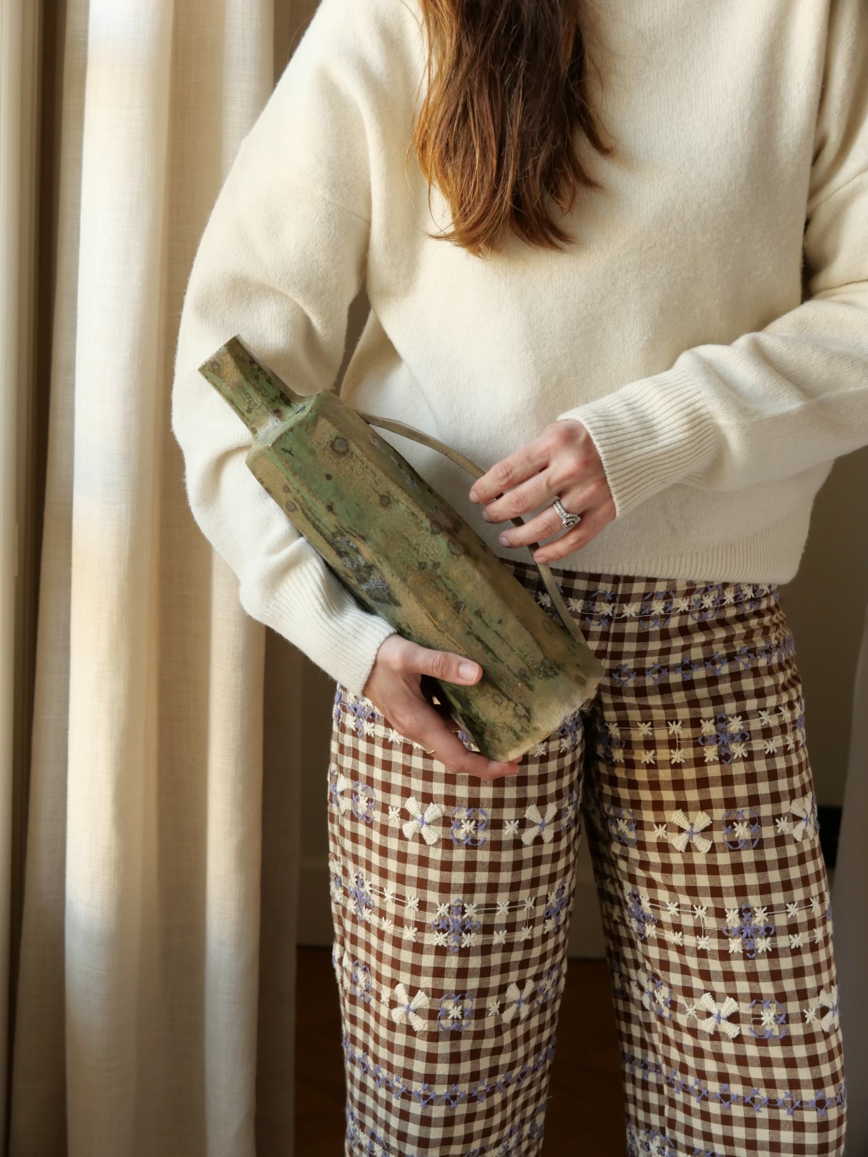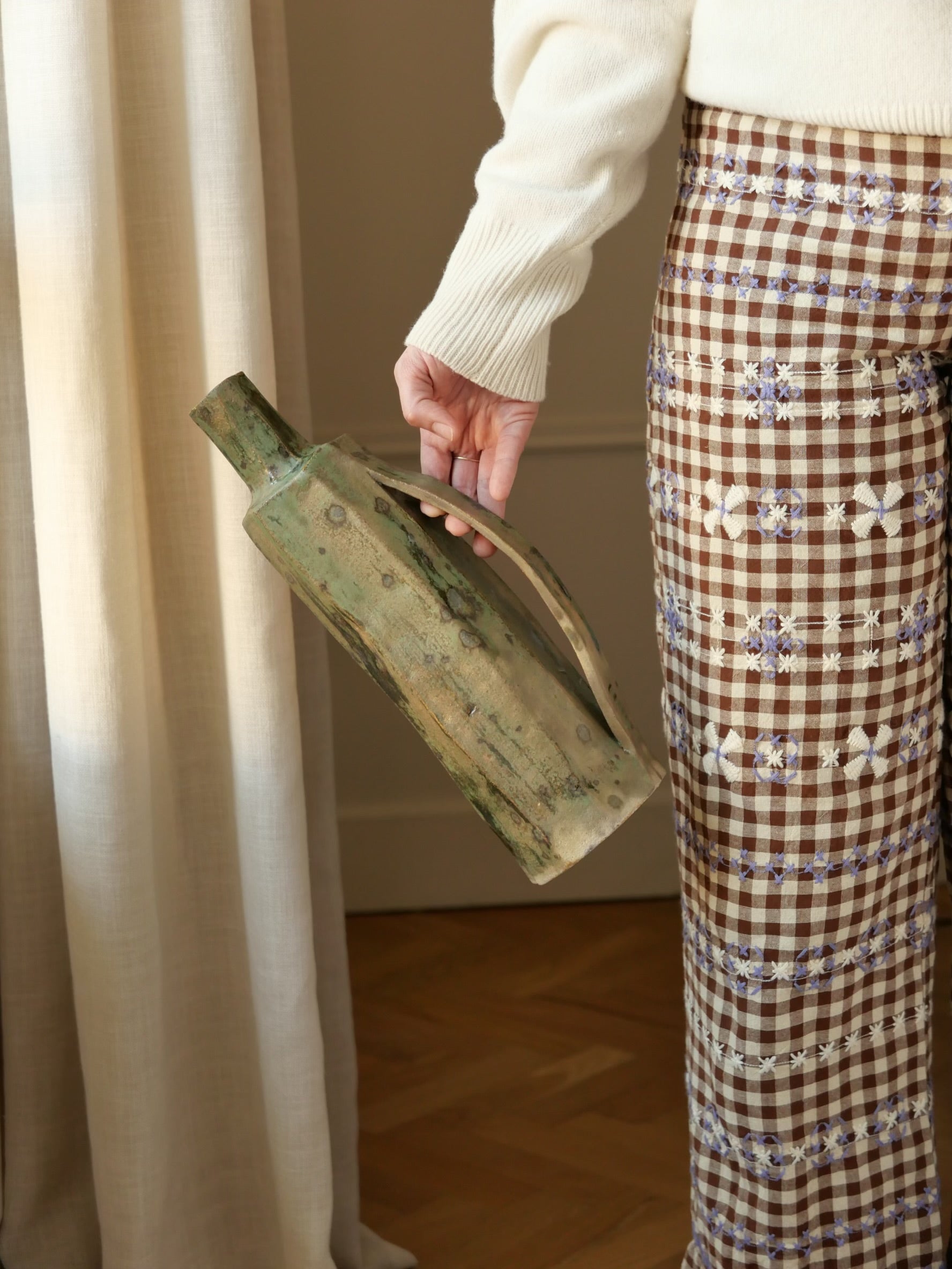 Ces pièces racontent le geste, la matière et le temps. Elles existent seules ou en duo, en jouant le contraste entre la lumière mate du beige et la profondeur métallique du vert.