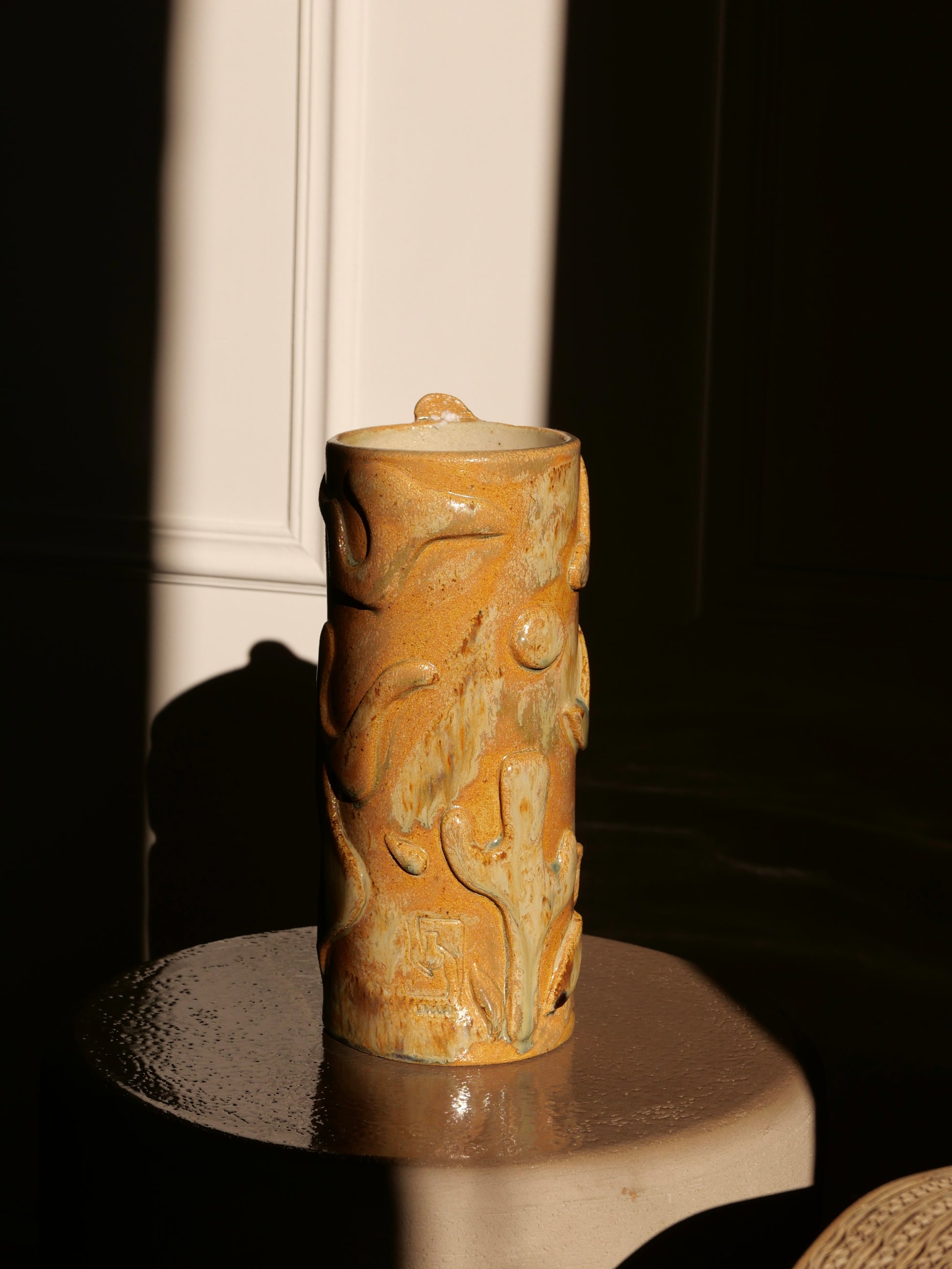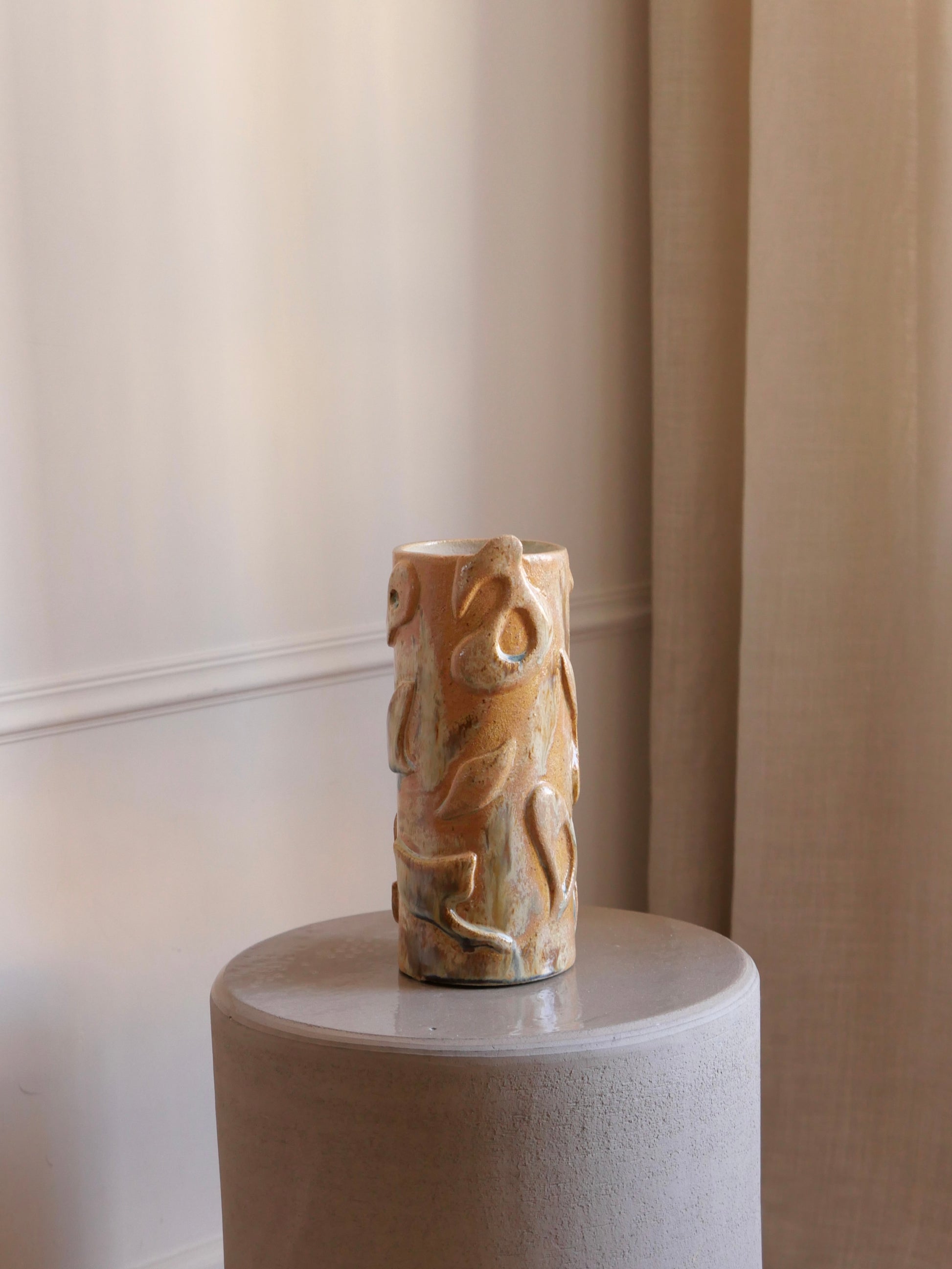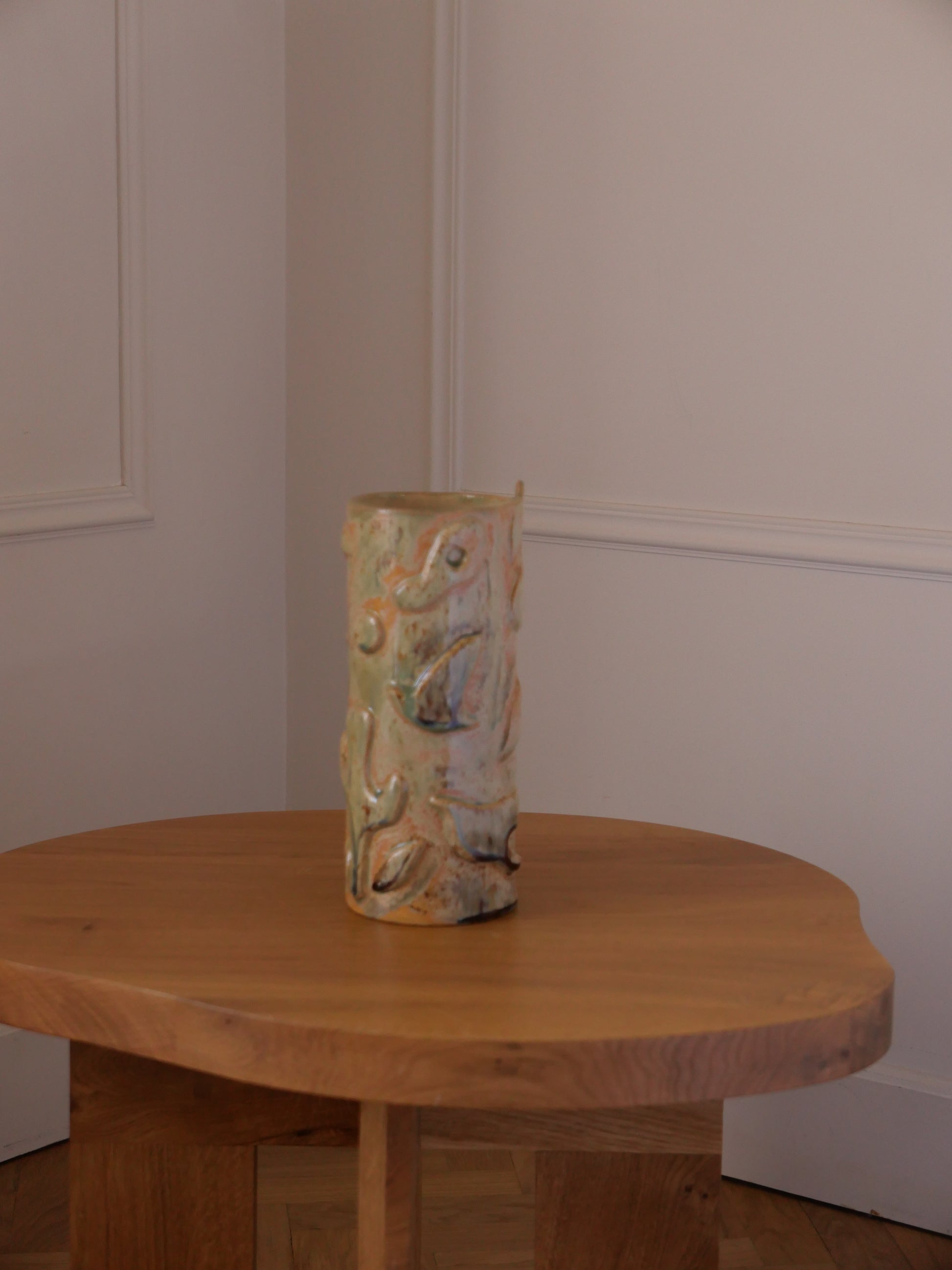 GIOIA signifie la joie en corse. Ce vase est une éloge joyeuse de la vie, il fait écho à la chaleur, aux mouvements. On l'imagine rempli de fleurs colorées, posé sur une table un soir d'été.
