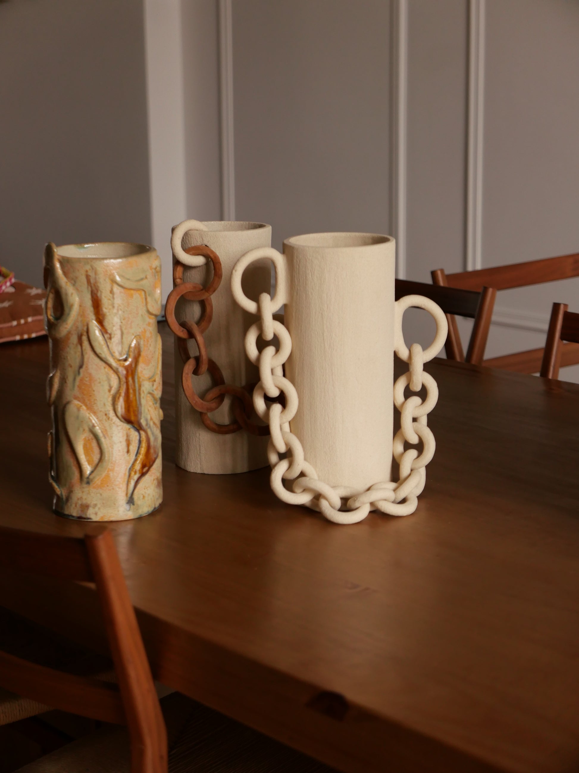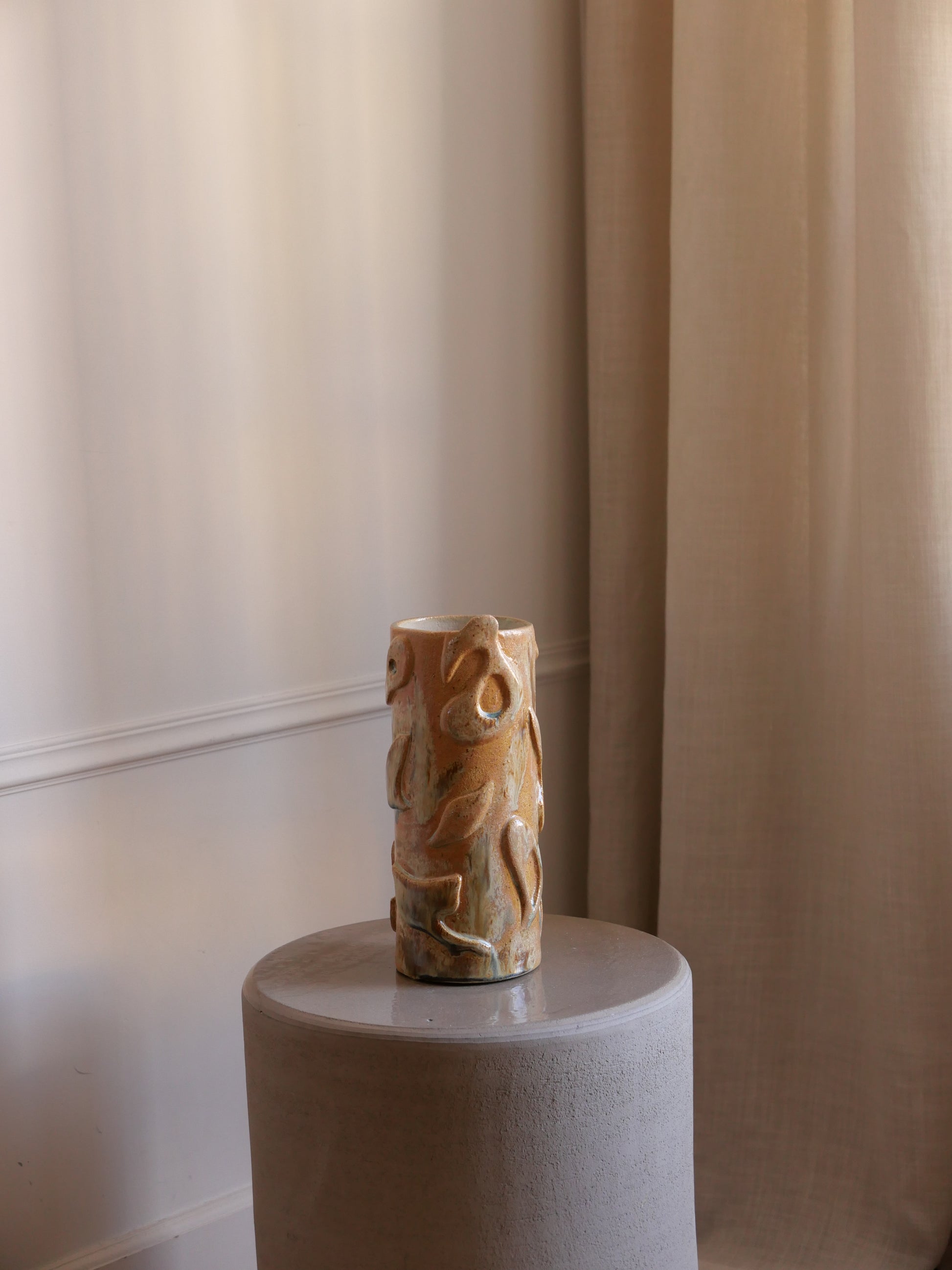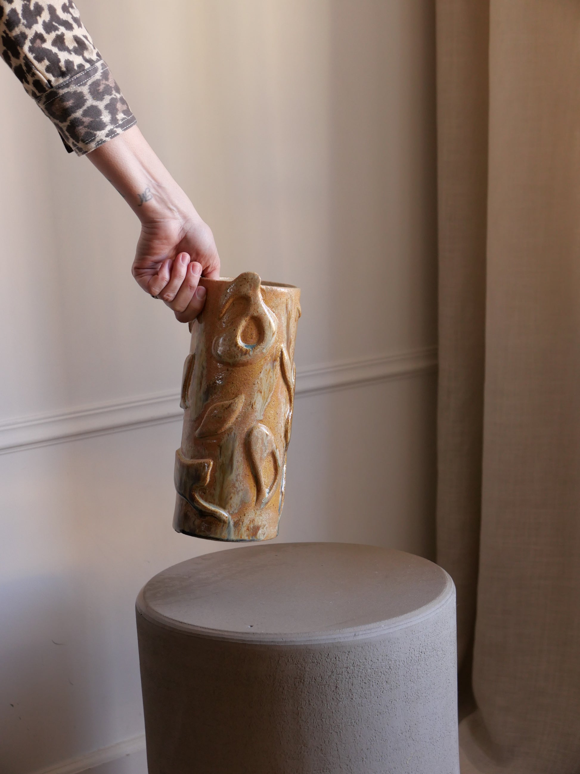 GIOIA signifie la joie en corse. Ce vase est une éloge joyeuse de la vie, il fait écho à la chaleur, aux mouvements. On l'imagine rempli de fleurs colorées, posé sur une table un soir d'été.