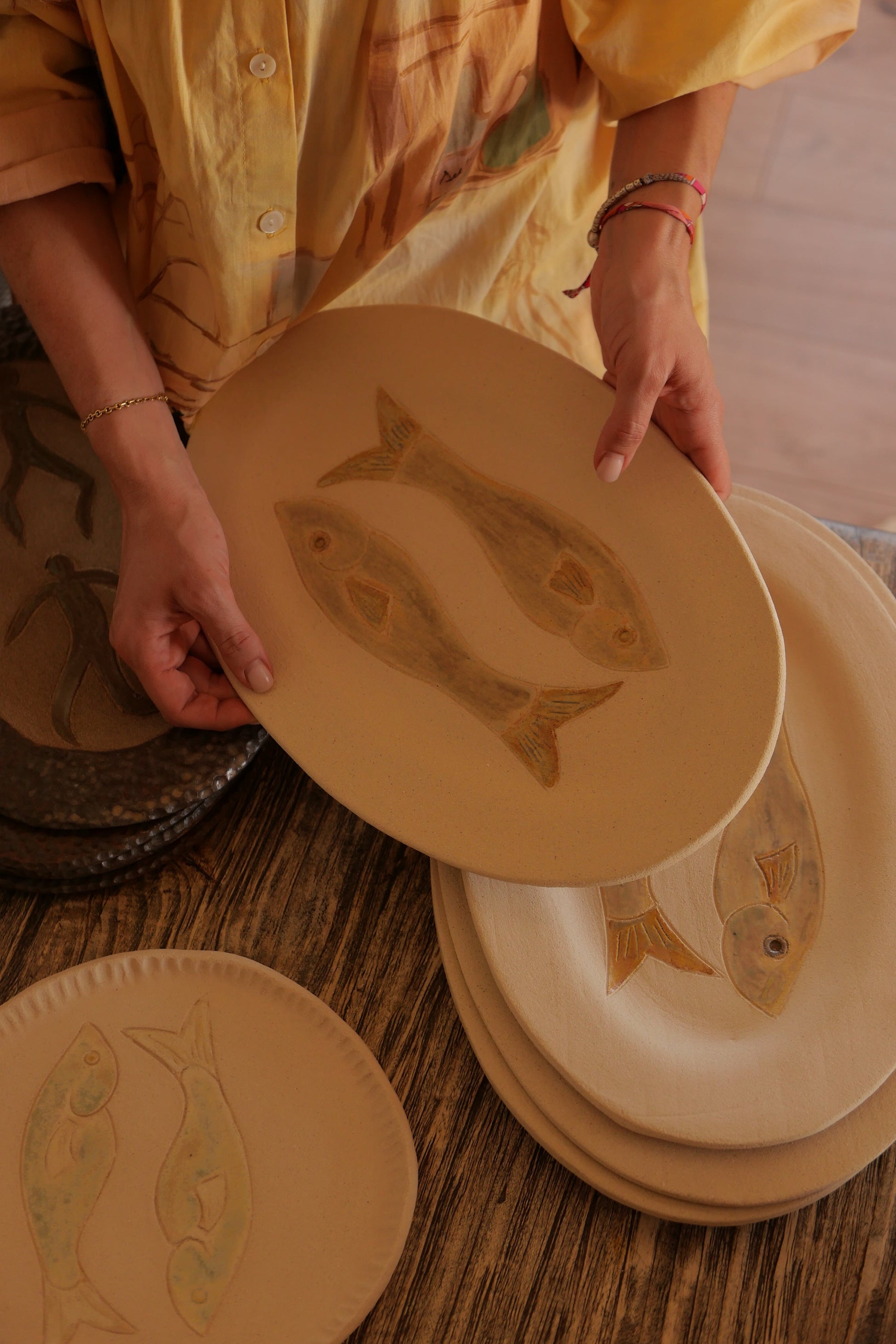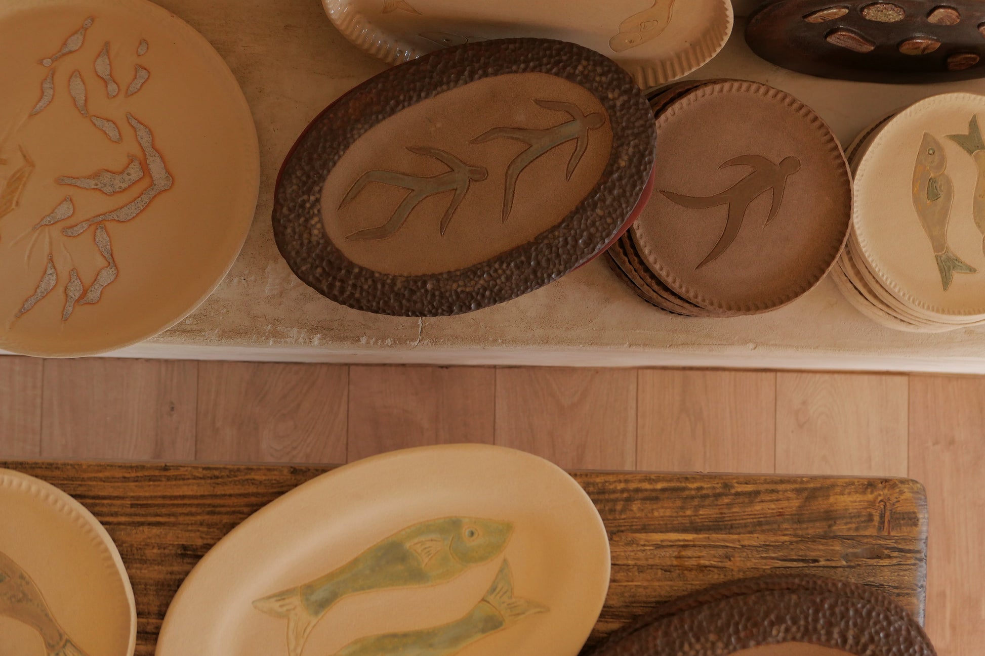 – Le Plat aux Personnages : gravé et martelé, il évoque la pierre taillée, les sols anciens, les figures primitives ancrées dans la terre.