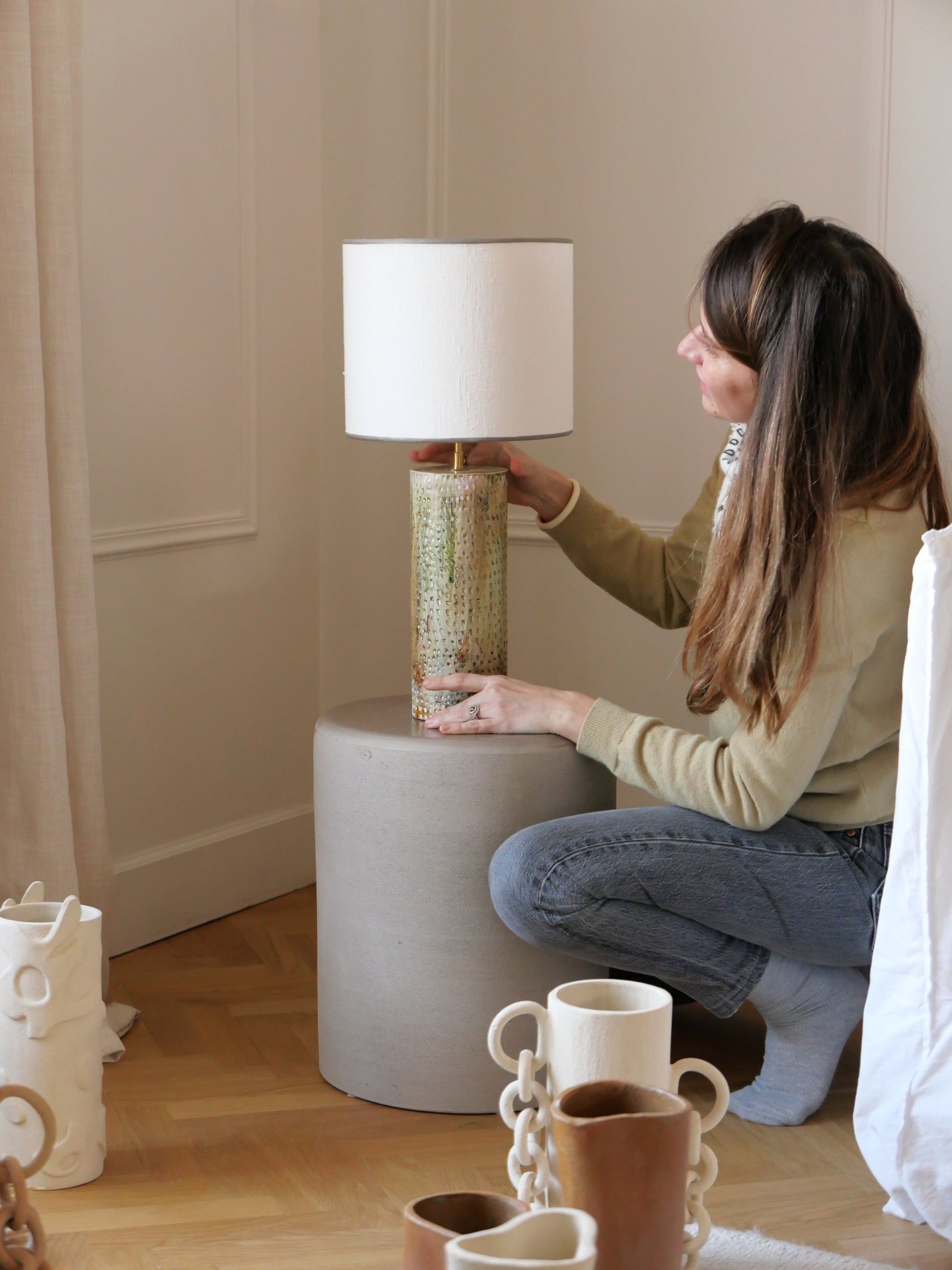 L'abat-jour est réalisé entièrement à la main en lin.