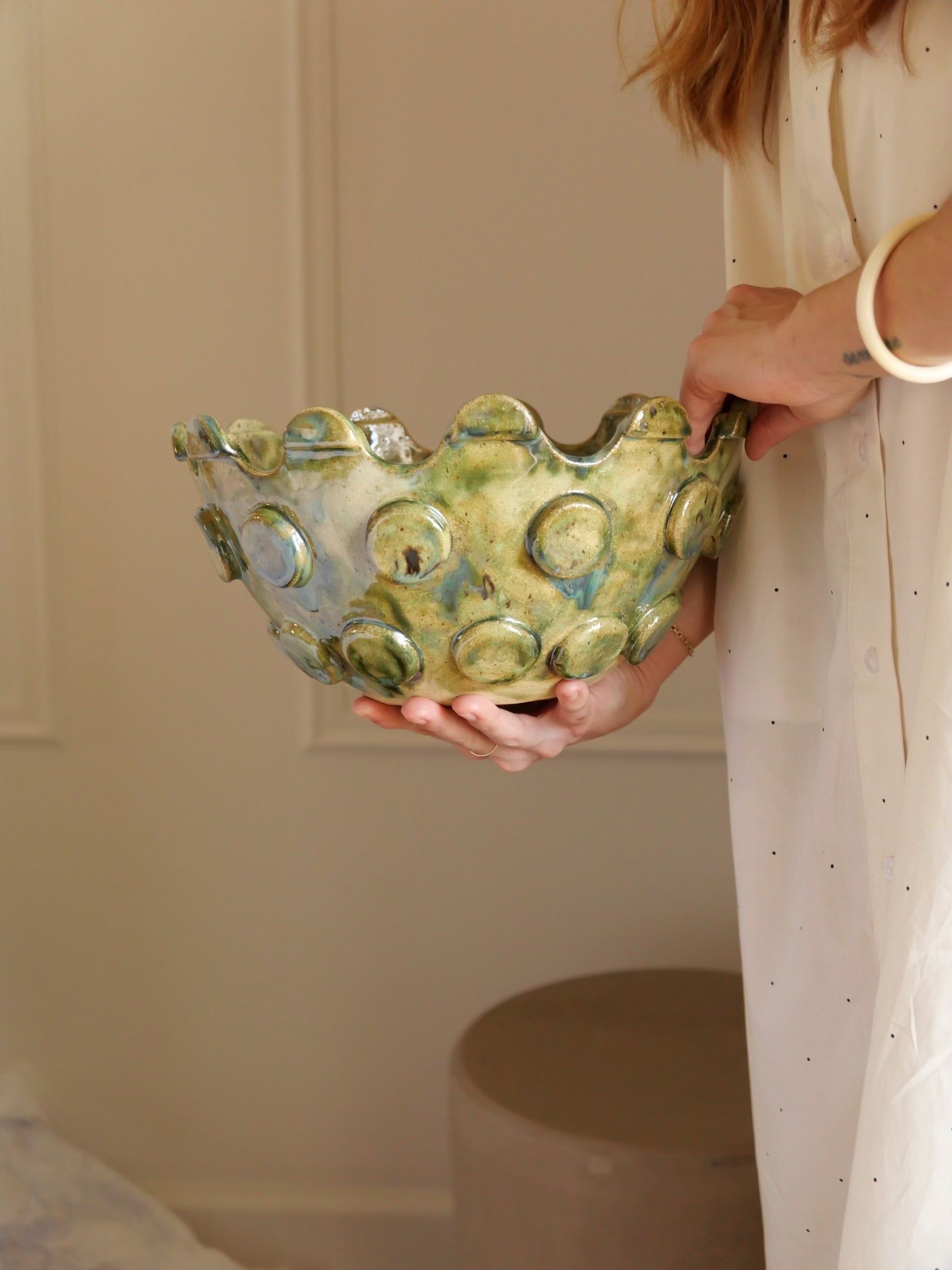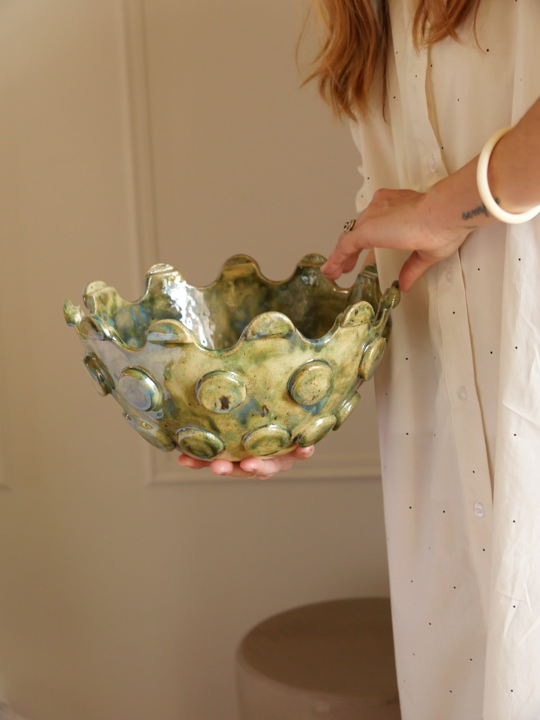 Ses courbes ondulantes, ponctuées de motifs circulaires en relief, en font une pièce au design singulier et tactile. L’émail, minutieusement travaillé, révèle une palette de verts mêlés à des tons sable, avec des variations profondes allant du vert bouteille au vert clair, presque translucide. Certains reflets évoquent l’eau, les rochers, la mer, tandis qu’une patine unique vient enrichir la surface à chaque cuisson.
