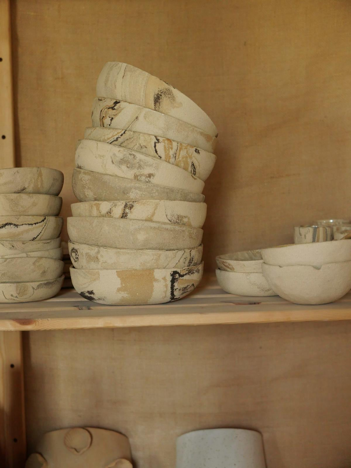 Chaque création est donc entièrement différente. Il existe plusieurs types de terres mêlées : des motifs plus géométriques, où des lignes et des traits apparaissent clairement, et des nuances plus fondues, avec des effets plus doux et organiques.