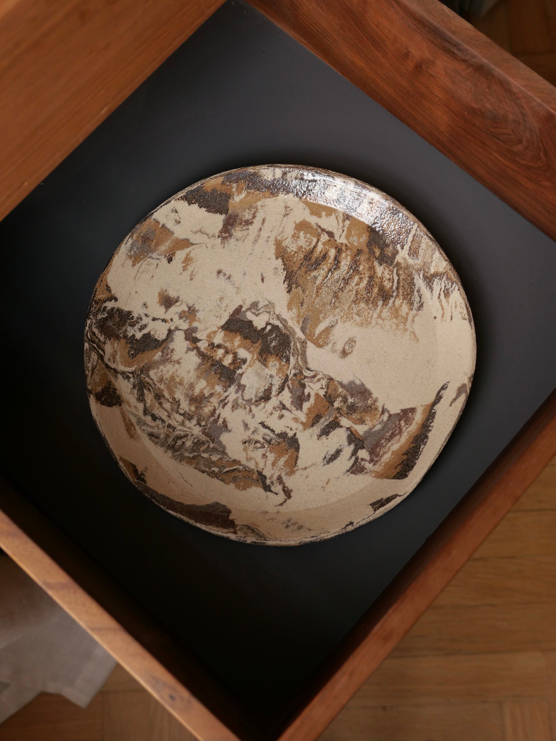 Chaque pièce est réalisée à partir d’un mélange de terres (grès) de différentes couleurs. Ce procédé unique donne un résultat totalement aléatoire : le mélange et le positionnement des couleurs varient naturellement. Une fois façonnées, les pièces sont poncées pour révéler les motifs créés par la rencontre des terres, offrant ainsi des structures uniques et imprévisibles.