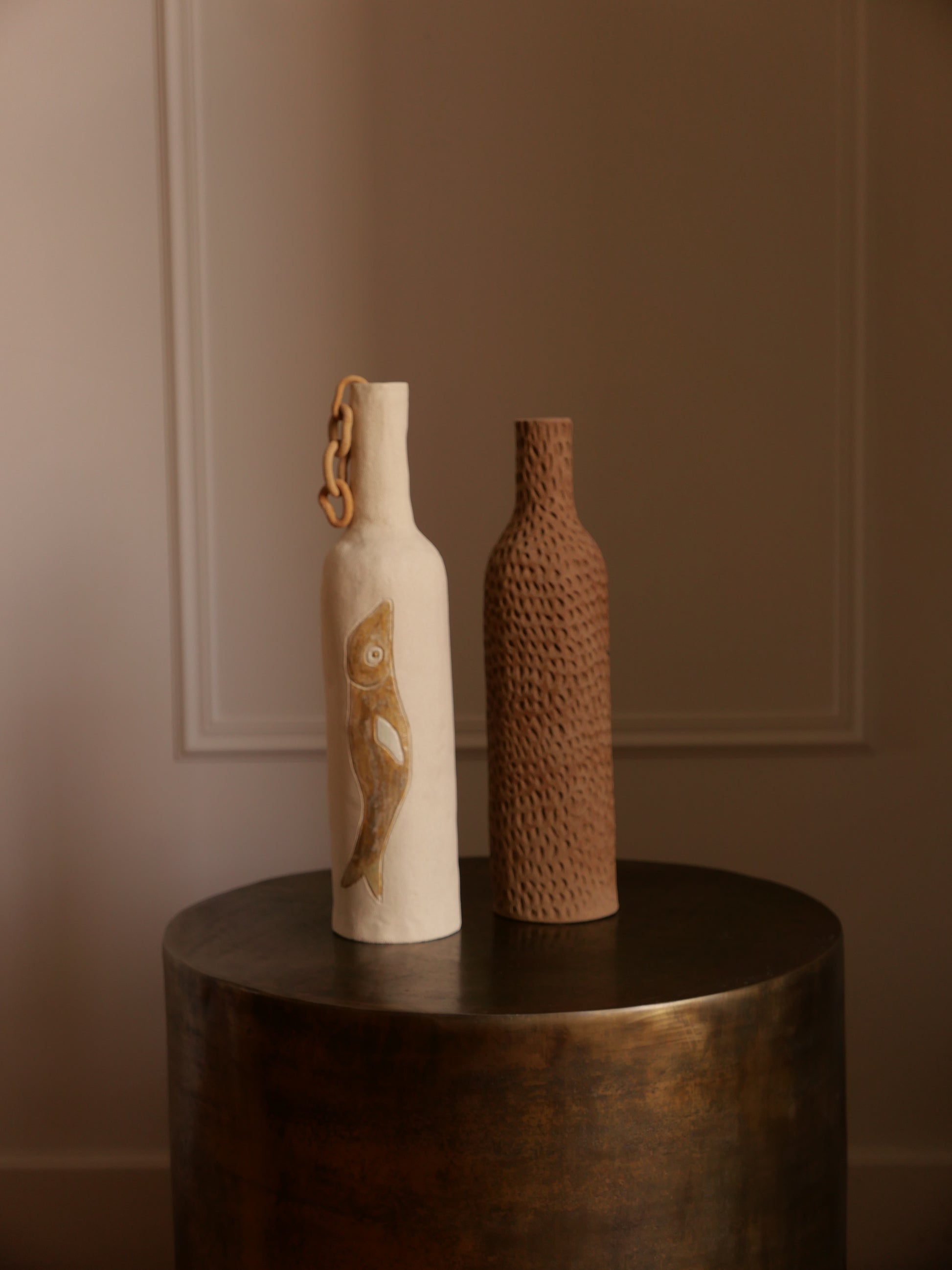 Façonnée à la main en grès chamotté beige, cette bouteille aux lignes élancées atteint entre 39 et 41 cm de hauteur. Sur sa surface brute, un motif de poisson, dessiné avec un émail aux nuances sable, blanc et bleu, vient ajouter une dimension organique et fluide. Comme un écho aux traces laissées par le temps, ce décor joue sur la transparence et la matière pour enrichir la profondeur de la pièce.
