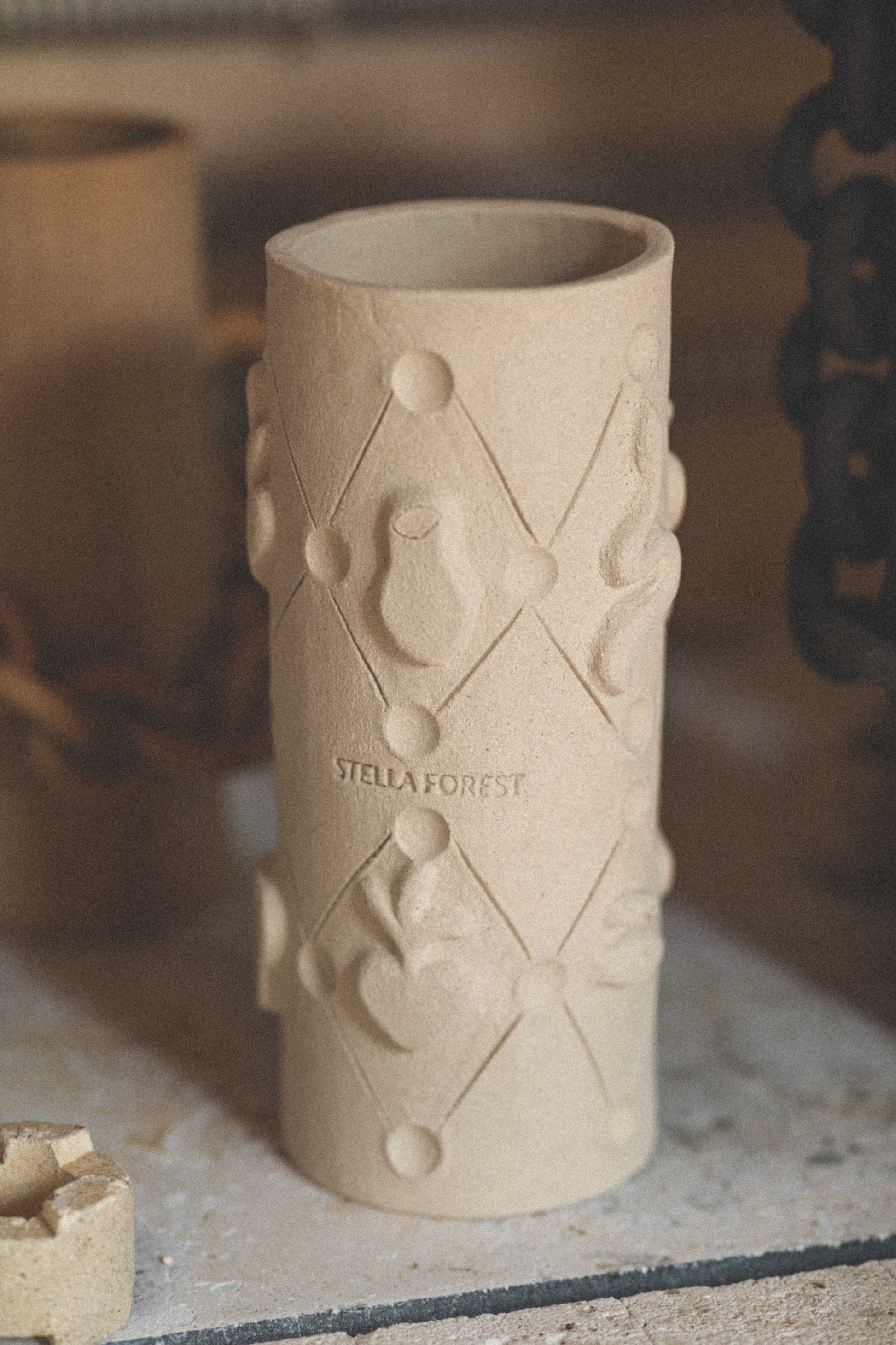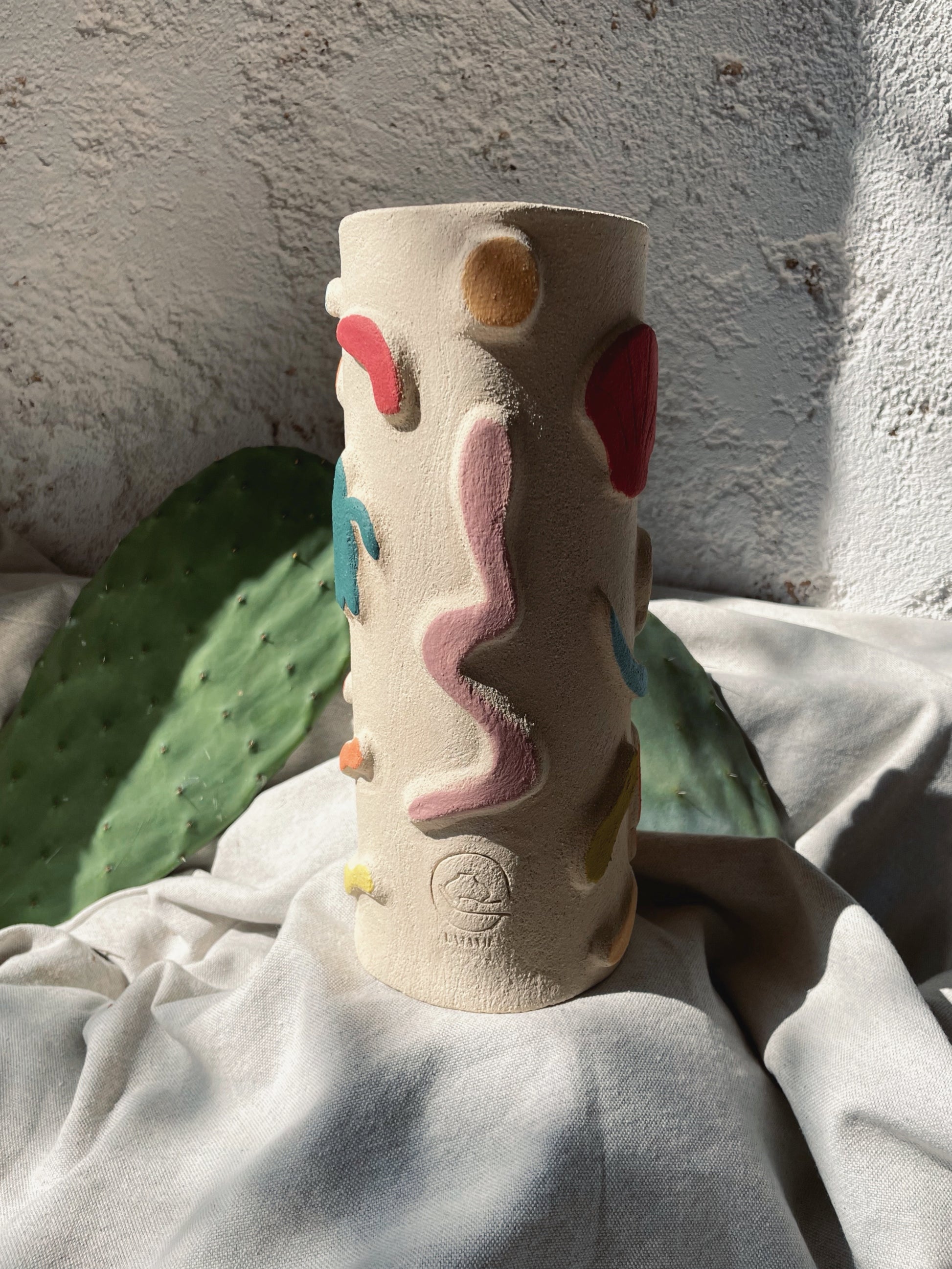 Ce vase est une éloge joyeuse de la vie, il fait écho à la chaleur, aux mouvements. On l'imagine rempli de fleurs colorées, posé sur une table un soir d'été.
